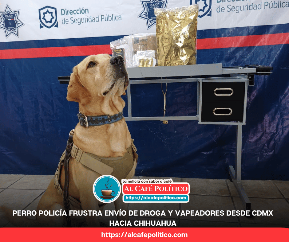 Durante la inspección, el can de seguridad mostró alteración al olfatear dos cajas de cartón color café provenientes de la Ciudad de México con destino a Cuauhtémoc, Chihuahua. Tras revisar el contenido, se localizó un paquete color dorado con la leyenda “CALIMEN”, el cual en su interior contenía hierba verde y seca con las características de la marihuana, además de tres vapeadores marca Ace Ultra Premium y una caja de vapeador marca Muha Meds, sabor Citrus Tsunami, ambos con indicios de contener la misma sustancia.