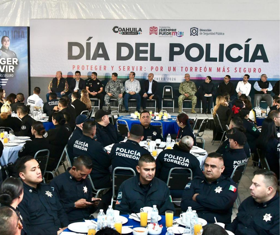 Torreón, .— En el marco del Día del Policía, el alcalde Román Alberto Cepeda González encabezó la conmemoración oficial y confirmó un aumento salarial para los elementos de la Policía Municipal, con lo que el ingreso promedio asciende a 19 mil 200 pesos mensuales, además de mejoras en seguros y prestaciones, vigentes desde el 1 de enero de 2026.