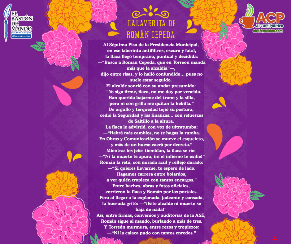 Quien sí notó el nuevo régimen de huellas y horarios fue #LadyFayuca, esa figura de Comunicación Social que pasó de intocable a checadora puntual, aunque desaparezca minutos después. Los rumores que bajan del primer piso apuntan a que anda furiosa con el alcalde Román Alberto Cepeda, soltando pestes entre pasillos.Según ella, lleva meses pidiéndole una audiencia personal y el edil la ignora, dándole —cito textualmente— “atole con el dedo”. Su molestia no es menor: acusa que Román le “debe compromisos” y no le cumplió nada de lo pactado.