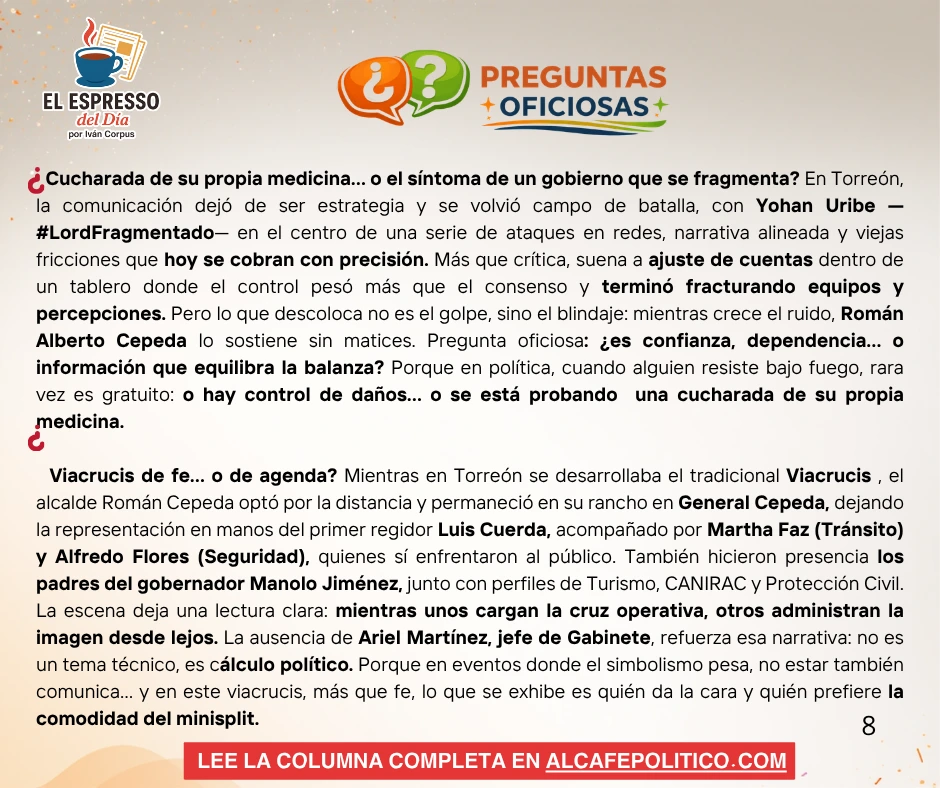 En Torreón, la comunicación dejó de ser estrategia para convertirse en campo de batalla. En el centro está Yohan Uribe, señalado como #LordFragmentado: un operador que, lejos de cohesionar, habría multiplicado las fracturas internas.
