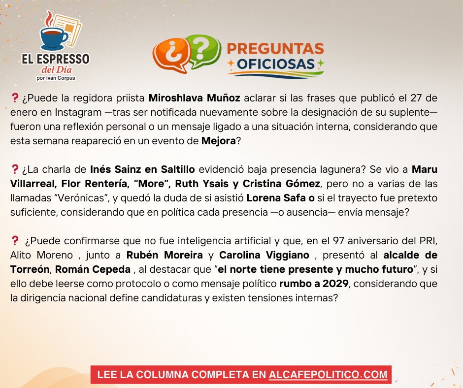 ❓ ¿Puede confirmarse que no fue inteligencia artificial y que, en el 97 aniversario del PRI, Alito Moreno , de espaldas la psreja de Rubén Moreira y Carolina Viggiano Austria, con sonrisas complives presentó al alcalde de Torreón, Román Alberto Cepeda González, al destacar que “el norte tiene presente y mucho futuro”, y si ello debe leerse como protocolo o como mensaje político rumbo a 2029, considerando que la dirigencia nacional define candidaturas y existen tensiones internas?