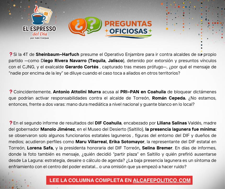 Si la 4T de Sheinbaum–Harfuch presume el Operativo Enjambre para ir contra alcaldes de su propio partido —como Diego Rivera Navarro (Tequila, Jalisco), detenido por extorsión y presuntos vínculos con el CJNG, y el exalcalde Gerardo Cortés Caballero, capturado tras meses prófugo—, ¿por qué el mensaje de “nadie por encima de la ley” se diluye cuando el caso toca a aliados en otros territorios? Coincidentemente, Antonio Attolini Murra acusa al PRI–PAN en Coahuila de bloquear dictámenes que podrían activar responsabilidades contra el alcalde de Torreón, Román Cepeda. ¿No estamos, entonces, frente a dos varas: mano dura mediática a nivel nacional y guante blanco en lo local?