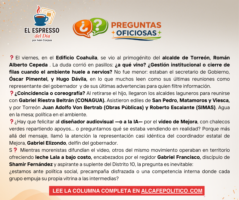 Y el viernes, en el Edificio Coahuila, se vio al primogénito del alcalde de Torreón, Román Alberto Cepeda González. La pregunta corrió en pasillos: ¿a qué vino? ¿Representación institucional o cierre de filas cuando el ambiente huele a nervios? No fue menor: estaban el Óscar Pimentel González y Hugo Dávila, en lo que muchos leen como mensajes internos y advertencias finales para quien filtre información.