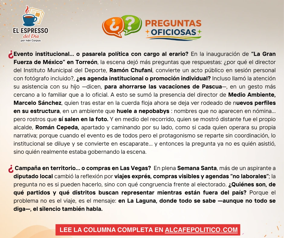 En la inauguración de “La Gran Fuerza de México” en Torreón, la escena dejó más preguntas que respuestas: ¿por qué el director del Instituto Municipal del Deporte, Ramón Chufani, convierte un acto público en sesión personal con fotógrafo incluido?, ¿es agenda institucional o promoción individual? Incluso llamó la atención su asistencia con su hijo —dicen, para ahorrarse las vacaciones de Pascua—, en un gesto más cercano a lo personal que a lo oficial. A esto se sumó la presencia del director de Medio Ambiente, Marcelo Sánchez, quien no hace mucho estaba en la cuerda floja y hoy se deja ver rodeado de nuevos perfiles en su estructura, en un ambiente que ya huele a nepotismo: nombres que no aparecen en nómina… pero rostros que sí salen en la foto.