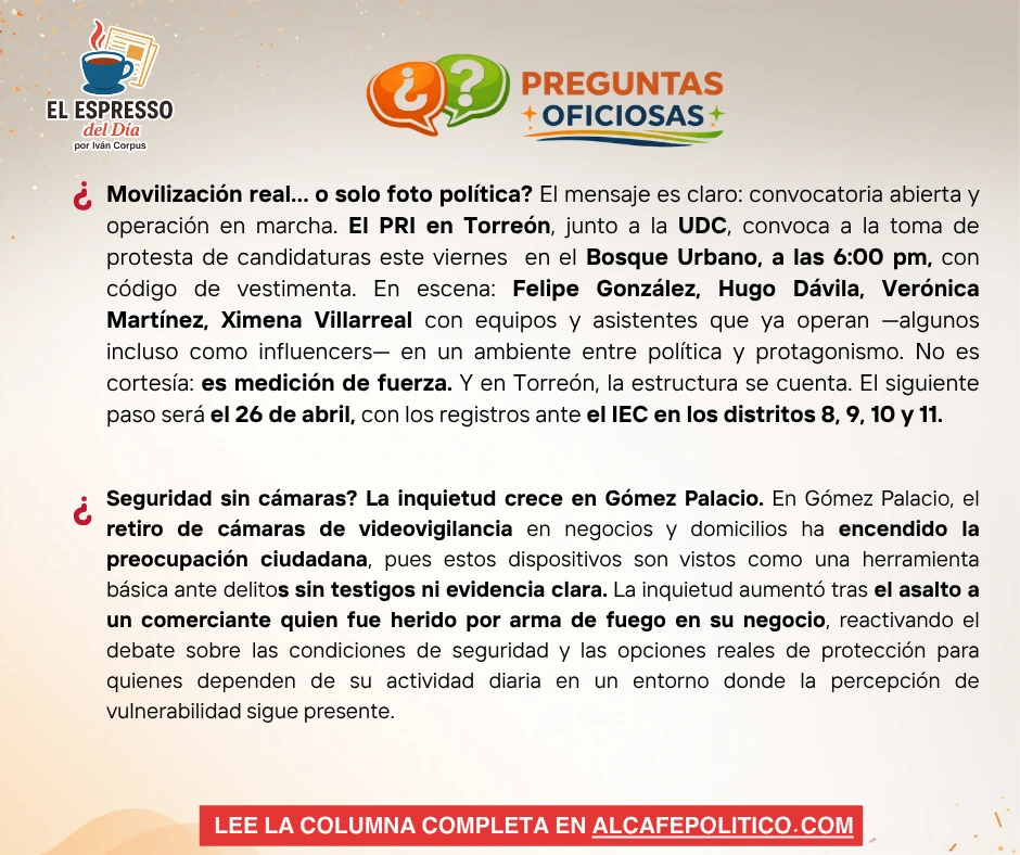 A este movimiento le sigue el calendario formal: conforme al Instituto Electoral de Coahuila, los registros de candidaturas del PRI para los distritos locales de Torreón se realizarán el 26 de abril (Distritos 8, 9, 10 y 11). Es decir, la foto de hoy no es el cierre… es el arranque real de la contienda.