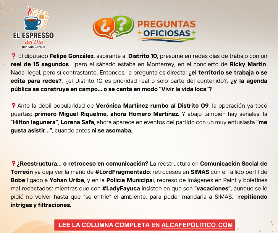 El diputado Felipe González, aspirante al Distrito 10, presume en redes días de trabajo con un reel de 15 segundos: imagen cuidada, narrativa de cercanía y mensaje de territorio. Pero el contraste no tardó. El sábado, el mismo legislador estaba en Monterrey, en el concierto de Ricky Martin, coreando “Vivir la vida loca”. Nada ilegal, sí revelador: cuando el discurso se construye en redes, el fuera de cuadro también cuenta.