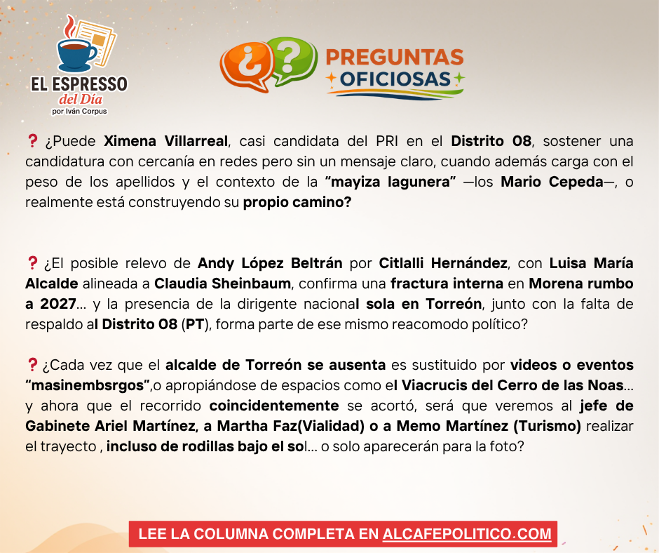 En Morena, las señales ya no son sutiles. La posible salida de Andy López Beltrán de la Secretaría de Organización y el eventual ascenso de Citlalli Hernández dibujan un reacomodo interno rumbo a 2027. En medio, Luisa María Alcalde aparece cada vez más alineada con la presidenta Claudia Sheinbaum, marcando una ruta distinta a la del hijo del expresidente. Las diferencias, que antes se susurraban, hoy empiezan a notarse en decisiones y silencios. Ese ajuste también se refleja en territorio. En Torreón, la dirigente nacional se dejó ver sola, respaldando a la mayoría de sus perfiles locales… pero con una ausencia que pesa: el Distrito 08 que va con el PT, donde Luis Ortiz Zorrilla no figuró en la misma dinámica. En política, lo que no se muestra también comunica. ¿Y su alianza?
