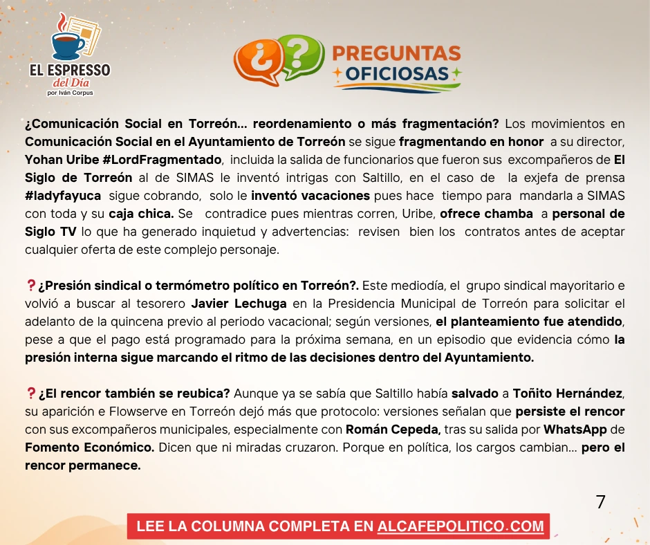Los movimientos en Comunicación Social en el Ayuntamiento de Torreón siguen generando versiones de fragmentación interna, con señalamientos hacia su director, Yohan Uribe #LordFragmentado, por cambios de personal y reacomodos en SIMAS, incluida la salida de excolaboradores de El Siglo de Torreón y la posible incorporación de perfiles cercanos, como el caso de una jefa de prensa que continuaría en nómina bajo un esquema administrativo. En paralelo, se habla de ofrecimientos a personal de Siglo TV y de esquemas de difusión fuera de lo institucional, lo que ha generado inquietud en el gremio; sin postura oficial hasta ahora, la recomendación entre comunicadores es clara: revisar contratos antes de aceptar cualquier oferta en medio de este escenario incierto.