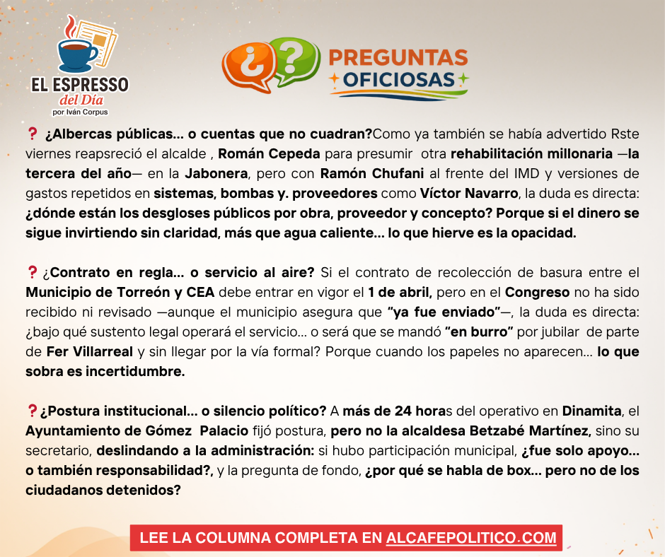 ❓Albercas públicas… o números que no flotan? Como ya se había advertido en columnas antretiones , el alcalde de Torreón, Román Cepeda, reapareció en la Jabonera presumiendo una inversión superior al millón de pesos en la rehabilitación de una alberca —la tercera en lo que va del año—. Pero aquí el punto no es la obra… es el costo. Porque mientras se aplauden las mejoras, nadie explica con precisión cuánto se está pagando realmente ni bajo qué condiciones.