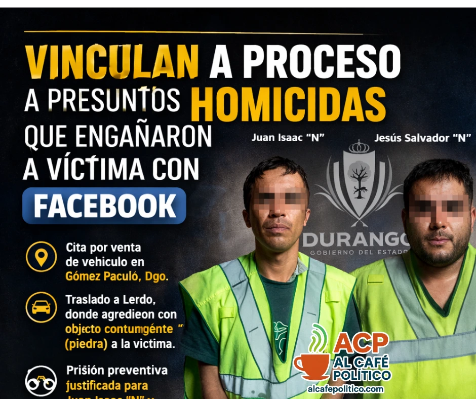 Domingo.- Dos hombres fueron vinculados a proceso por el homicidio de un adulto mayor en Gómez Palacio. De acuerdo con la investigación, la víctima fue contactada mediante una supuesta compra de vehículo publicada en Facebook. El crimen ocurrió en Lerdo y derivó en el robo de la unidad.