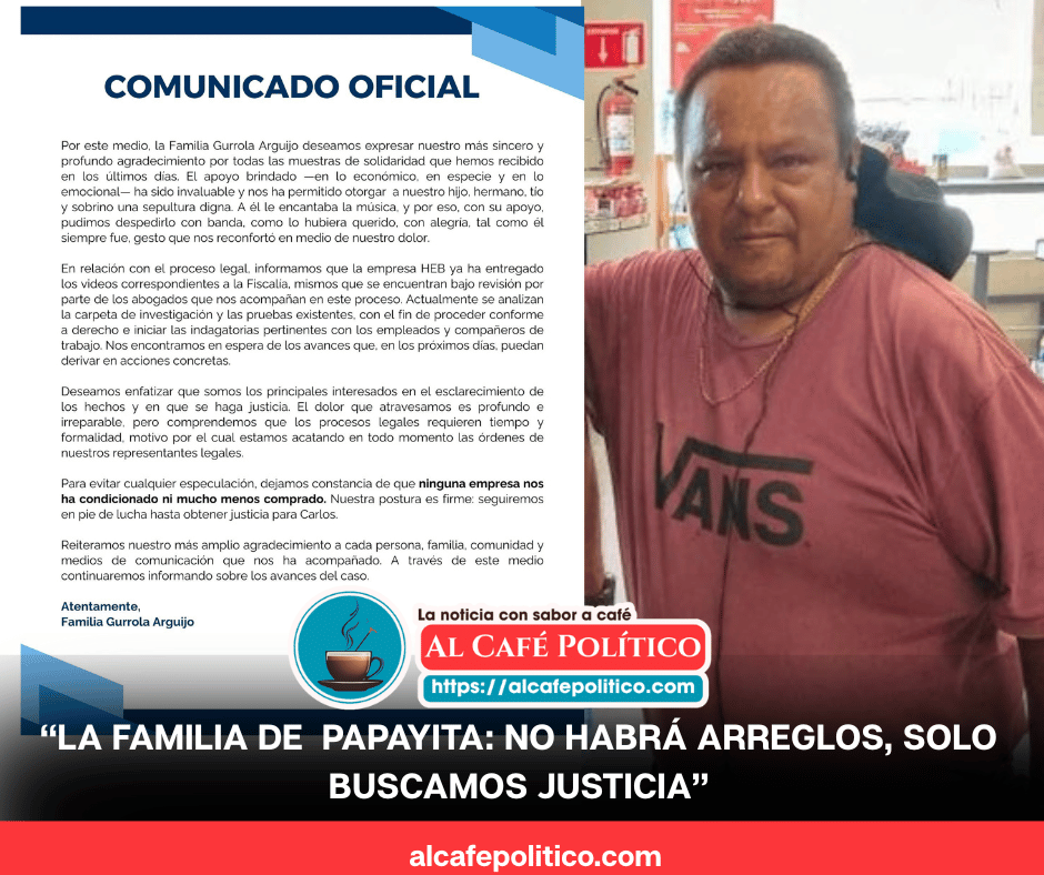 Torreón, Coahuila. — La familia Gurrola Arguijo emitió un comunicado oficial en el que agradeció las muestras de solidaridad recibidas tras el fallecimiento de Carlos Gurrola «Arguijo, joven trabajador de HEB, y aseguró que no se dejarán intimidar en la búsqueda de justicia.