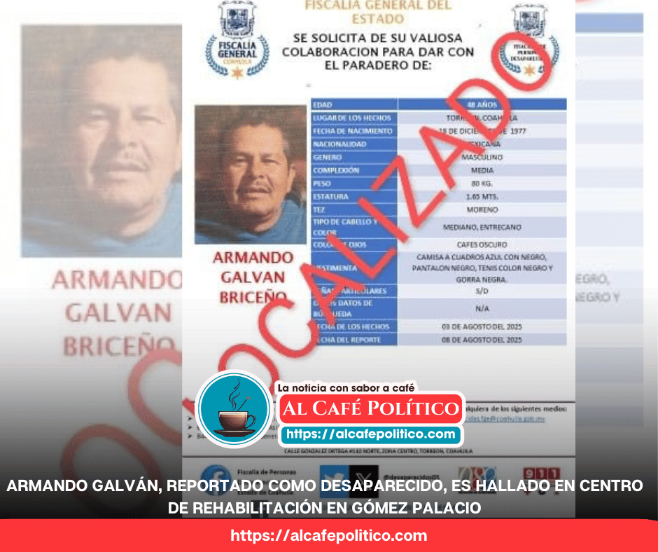 Gómez Palacio, Dgo.– La Comisión de Búsqueda de Personas del Estado de Coahuila confirmó que Armando Galván Briceño, de 48 años, fue localizado este lunes en un centro de rehabilitación de Gómez Palacio, tras haber sido reportado como desaparecido desde el 3 de agosto.