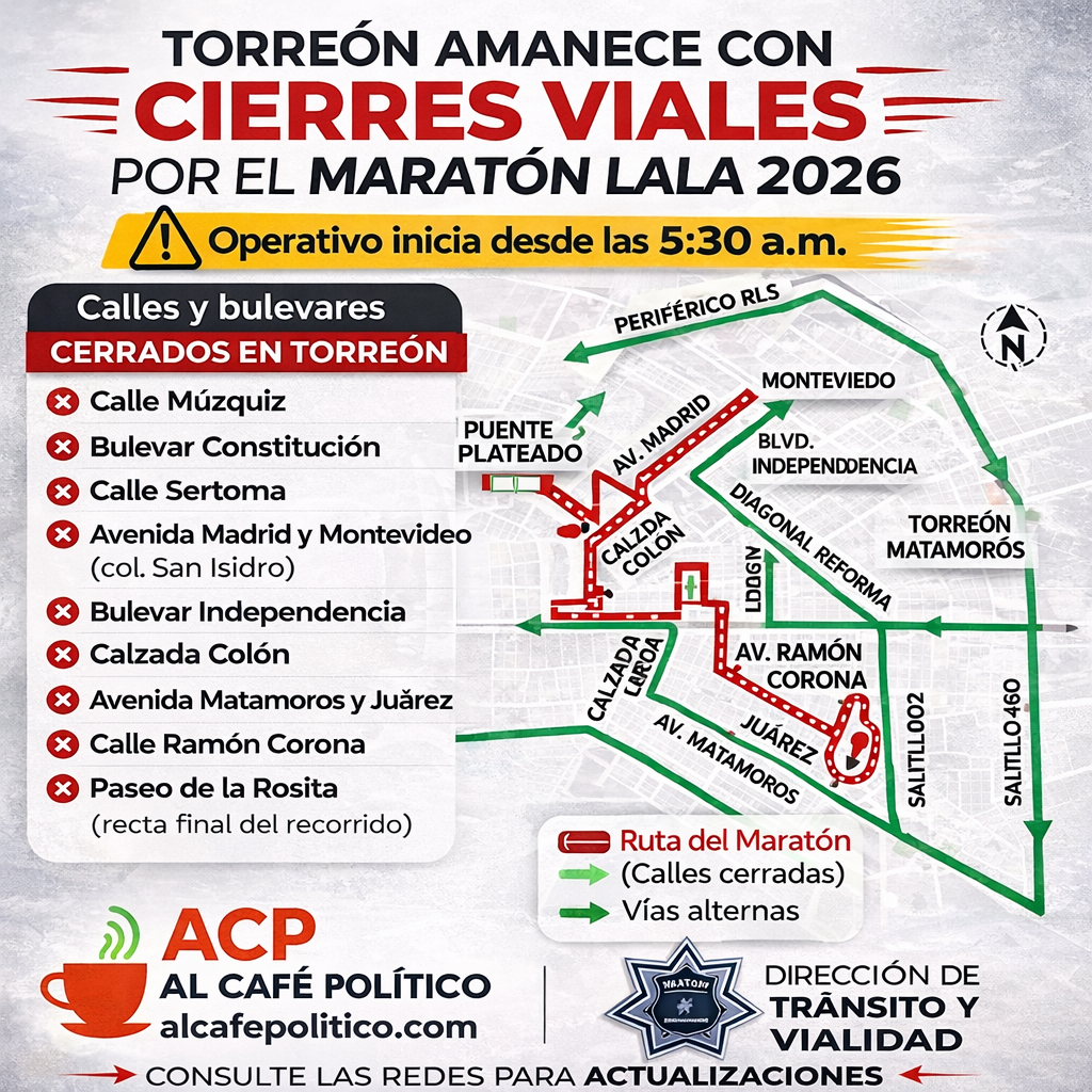 Torreón vivirá una jornada deportiva de alto impacto internacional. La invitación es clara: paciencia al volante y respeto a quienes correrán los 42 kilómetros. El tráfico vuelve… pero la medalla es para todos.