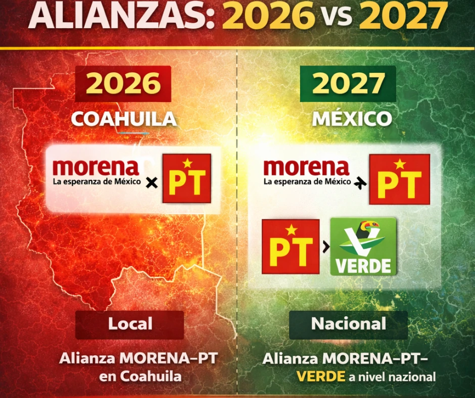 Aunque a nivel federal Morena, PT y el Partido Verde mantienen una alianza rumbo a 2027, en Coahuila el PVEM ha definido competir en solitario en el proceso local de 2026, por lo que no forma parte del convenio de coalición estatal, el cual queda integrado únicamente por Morena y el PT.