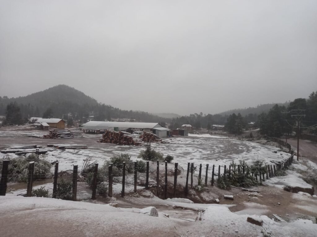 Tepehuanes, en la Sierra Madre Occidental de Durango, se ha visto cubierto por nieve o lluvia engelante en sus elevaciones más altas, resultado directo del desplazamiento del Frente Frío 27 y la llegada de aire polar.