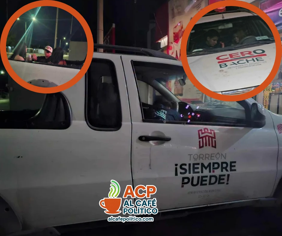 Las imágenes compartidas muestran una camioneta tipo pickup blanca con rotulación visible del programa “CERO BACHE” en el cofre, así como el logotipo institucional con la leyenda “Torreón ¡Siempre Puede!” en los costados, confirmando su carácter oficial. En las fotografías se observa que la unidad circula sin placas visibles; en la cabina viajan dos jóvenes y en la parte trasera se aprecia a otros ocupantes, uno de ellos con una bebida en lata en la mano, presuntamente alcohólica, todo en un contexto nocturno sobre vía pública.